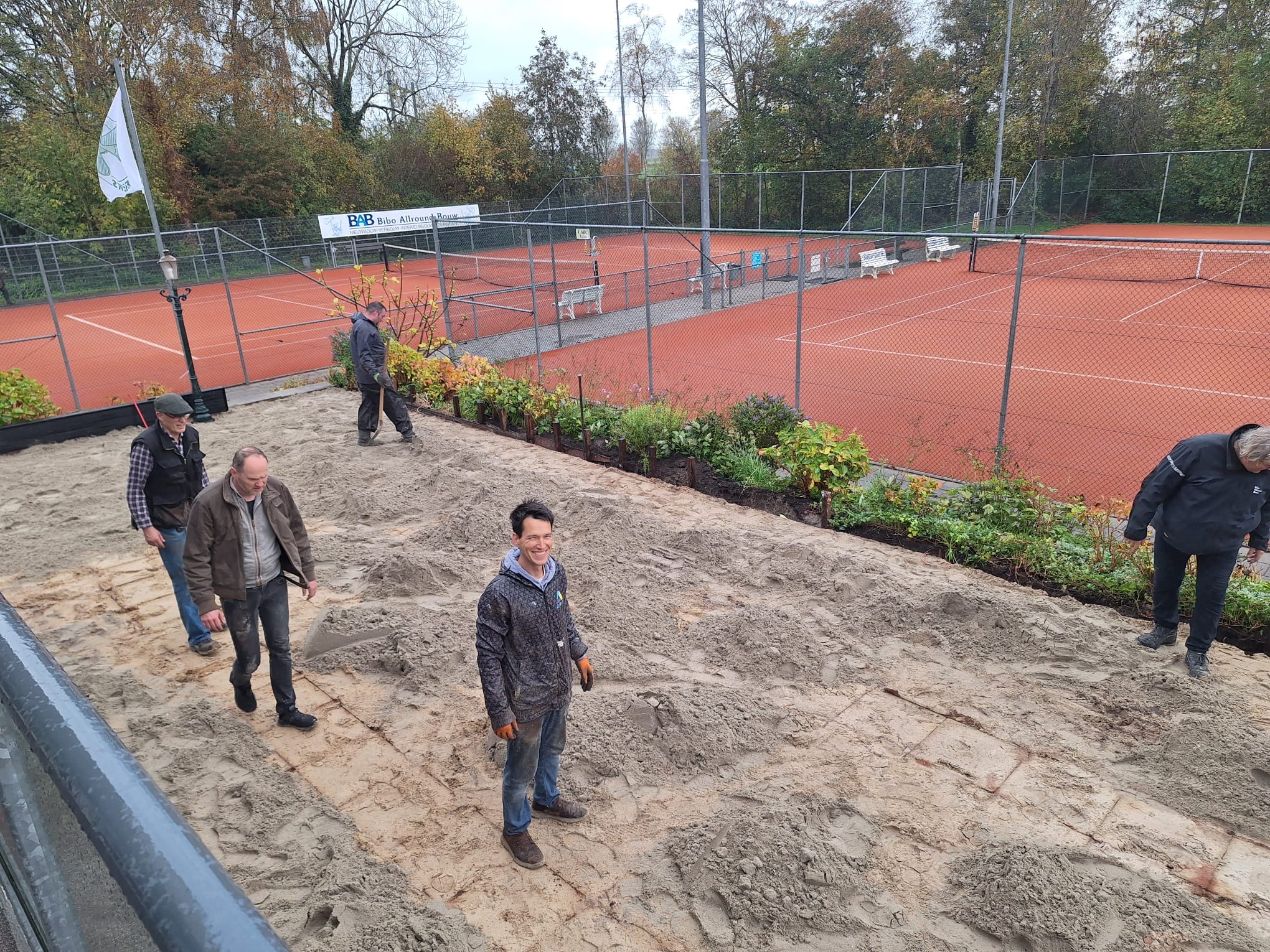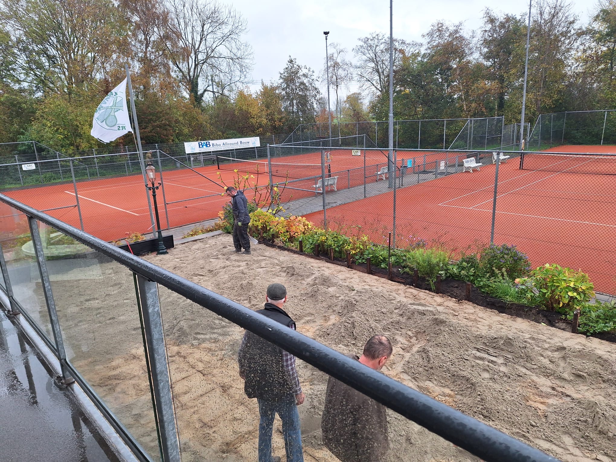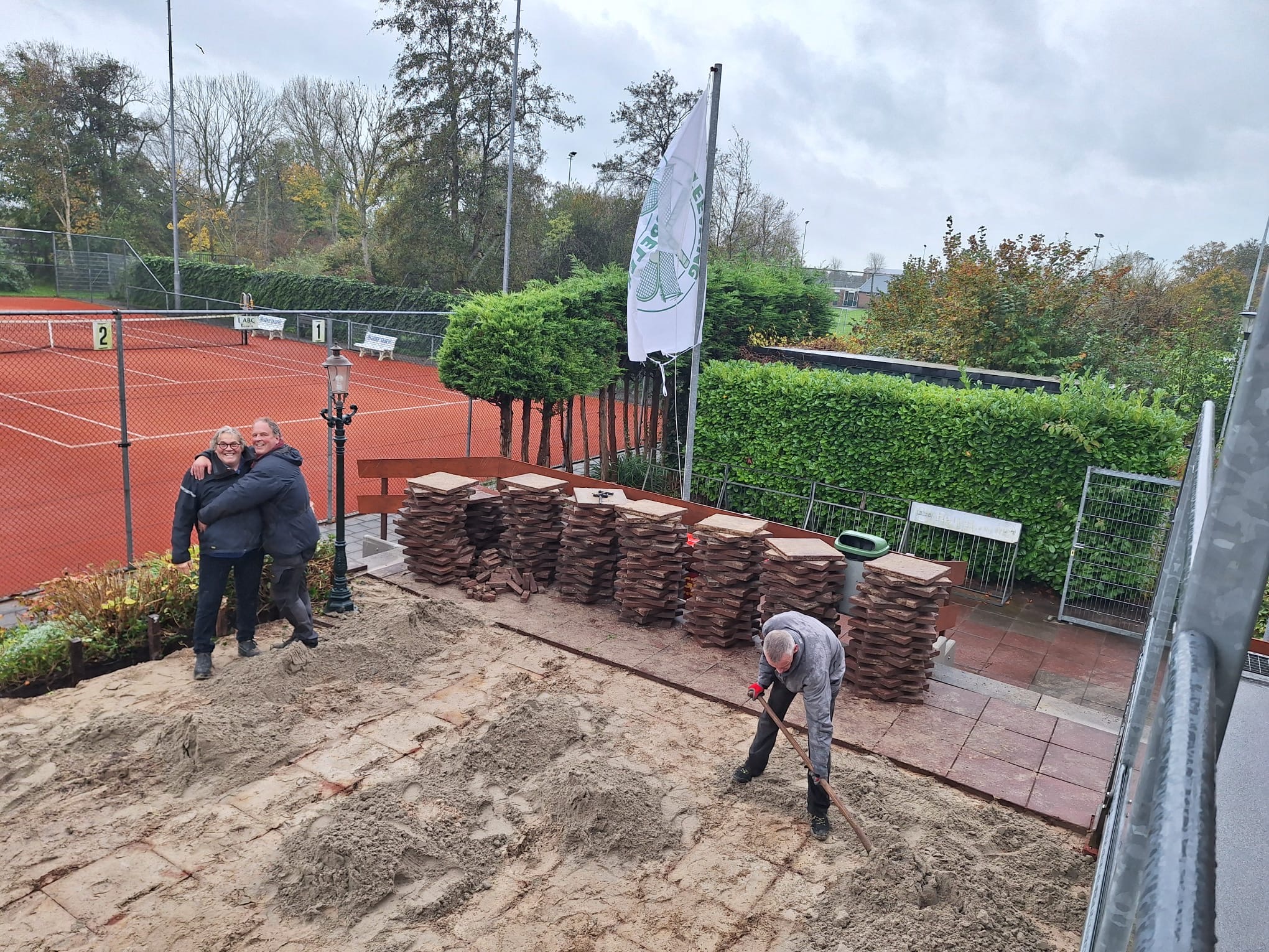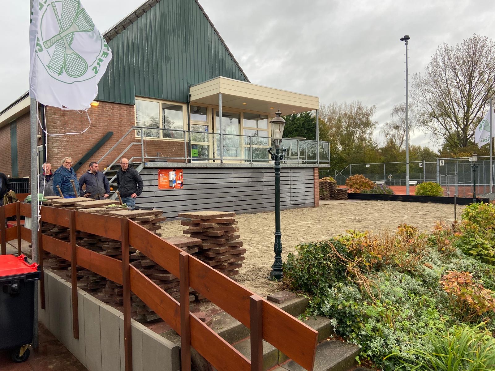 De terrastegels gingen eruit zodat Alwin Bibo de bestrating er op 3 en 4 november weer netjes kan inleggen met een goede afwatering. Daarvoor moesten natuurlijk ook de tafels en stoelen worden weggehaald, deze overwinteren nu in het voorraadhok. Ook werd er veel opgeruimd en richting gemeentewerf gebracht. Verder natuurlijk het nodige sopwerk.